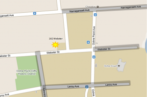 You may park on Lawrence Avenue (which is to the West just around the corner from our building), on Webster Street along the side of Ochre Court in the marked parking spaces, on Leroy Ave or on Ochre Point Avenue close to the Chapel or any of the areas highlighted in gray on the map.  Parking lots are used by permit holders only.  There is no parking on Webster Street directly in front of our building or in our driveway.